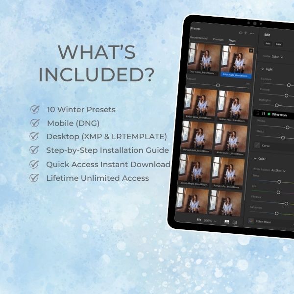 Save time and create professional, winter-inspired photos instantly. Each preset is versatile, easy to use, and perfect for a consistent seasonal look.