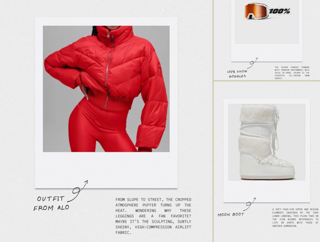 Outfit by Alo Cropped Atmosphere Puffer and 7/8 High-Waist Airlift Legging, Moon Icon Faux-Fur Boots & 100% VALNOR® Goggle: Red winter in motion